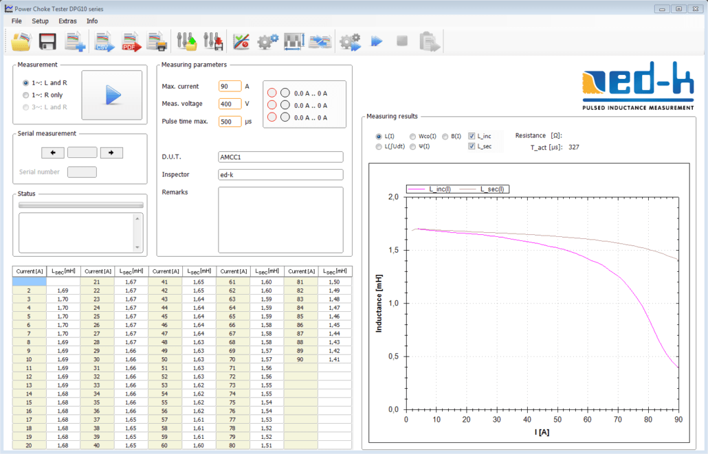 测量完成后,测量结果 L(i) 将以图表和表格形式显示。另外,电感也可以表示为施加到被测件上的电压-时间面积 ∫U(t)dt 的函数。