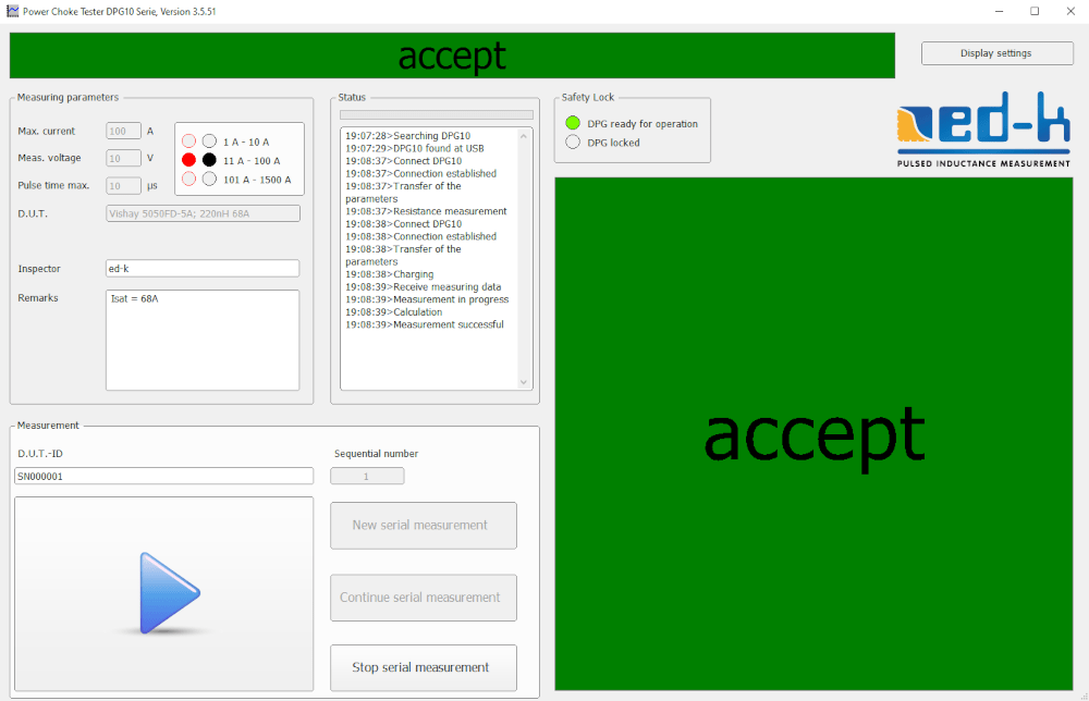 Die Bedienung des Power Choke Tester DPG10 und die Darstellung der Messergebnisse erfolgt über einen PC mittels einer neu entwickelten, einfach zu bedienenden grafischen Benutzeroberfläche. Dazu wird das Messgerät entweder über USB oder über die RS232-Schnittstelle mit dem PC verbunden.
